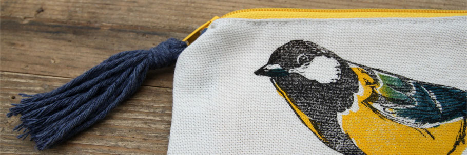 Petite trousse ornée d'une mésange imprimée artisanalement au tampon (linogravure, encre écologique)